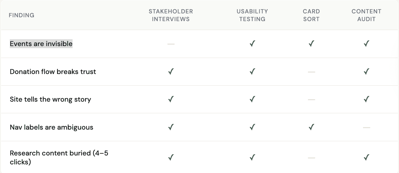 Our Greenway gave us a clear brief: the website needed to grow with the organization. With that direction, we ran four research methods to understand where the website was falling short and for whom.