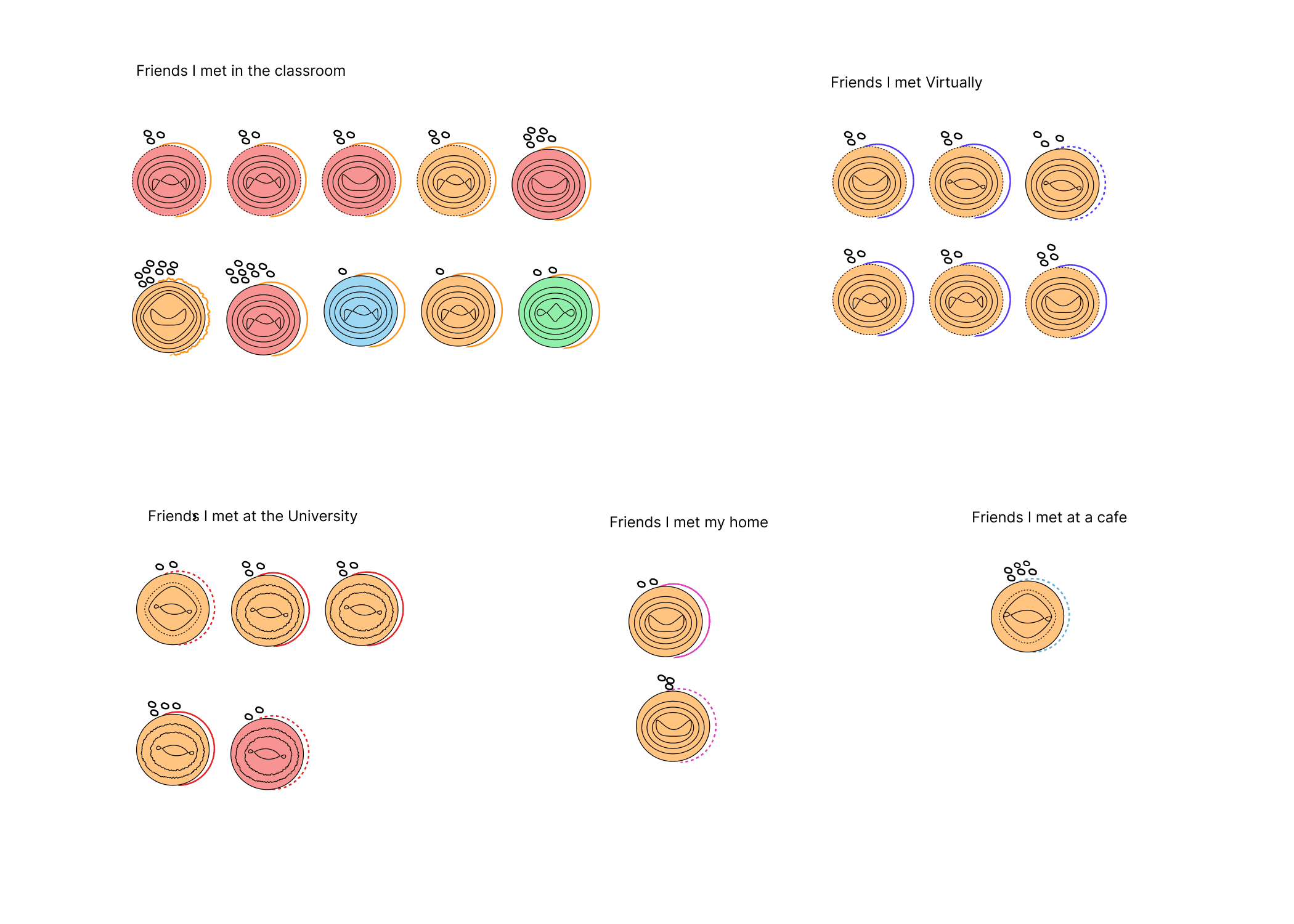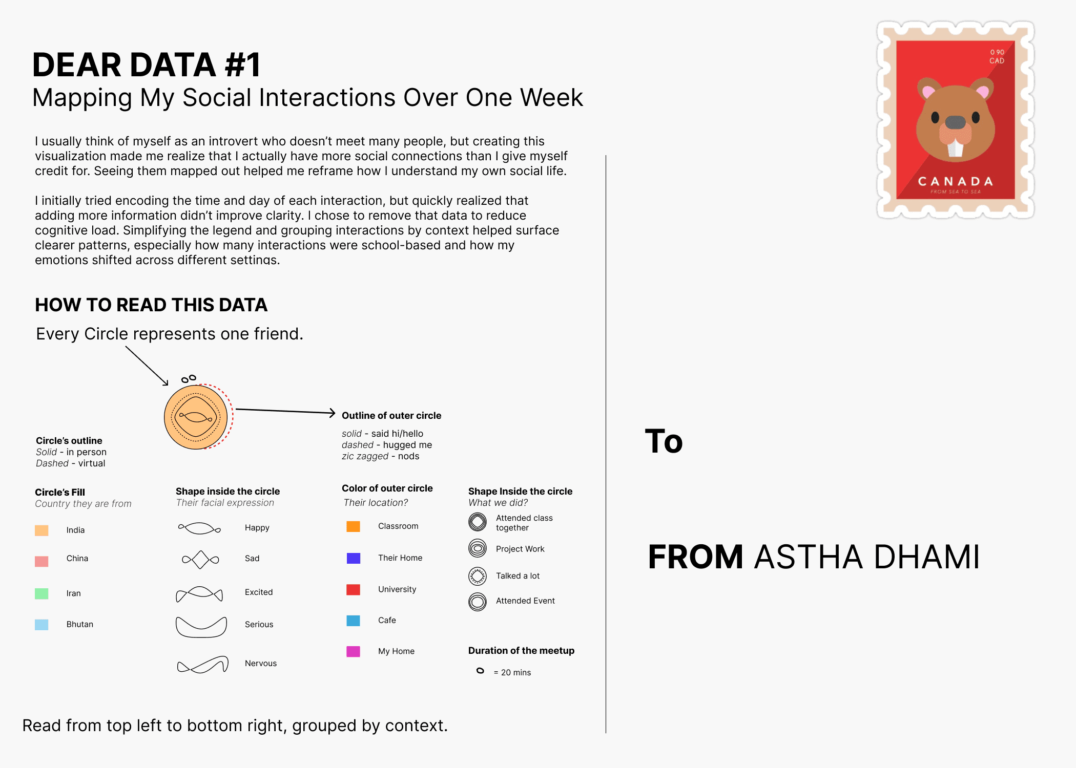 Inspired by Georgia Lupi’s Dear Data project, this visualization is a personal experiment in collecting and encoding everyday social interactions over one week. Using abstract symbols, color, and form, I mapped who I met, where interactions happened, how we connected, and the emotions involved. Through iterative simplification, I reduced cognitive load and grouped interactions by context to surface patterns—most notably the dominance of school-based interactions and shifts in emotional experience across settings.
