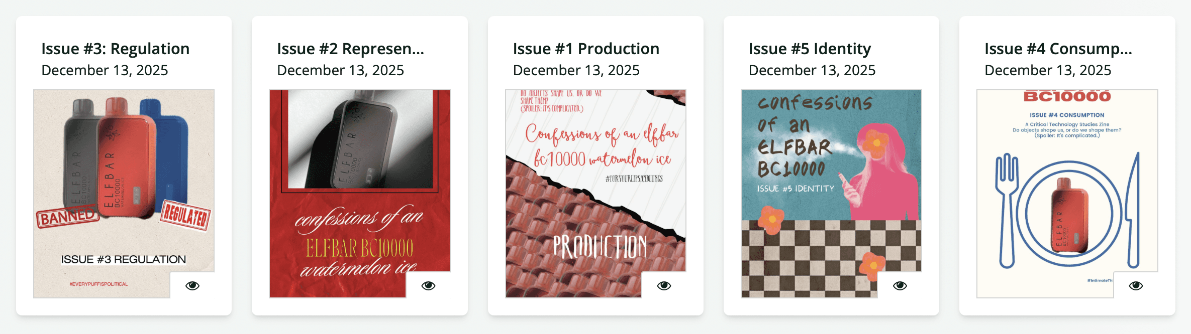 I researched and designed a five-issue zine collection that explores how a single disposable vape device becomes meaningful through production, marketing, law, identity, and neurochemistry. This project combines peer-reviewed research, industry analysis, government documents, and neuroscience to reveal the systems that created the global youth vaping epidemic.